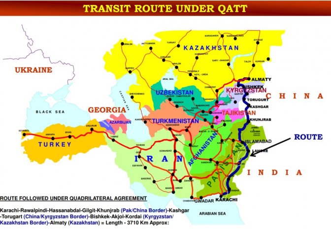 2. توافقنامه دیگری با عنوان «توافقنامه ترافیک چهار جانبه در ترانزیت (QTTA)» توسط پاکستان ، چین ، قرقیزستان و قزاقستان در 09 مارس 1995 در اسلام آباد 15 سال زودتر از APTTA امضا شد. بعداً ، در سال 2017 تاجیکستان نیز مایل به پیوستن به این توافق بود در حالی که کابل تمایلی به نهایی کردن توافق تجاری تجاری با اسلام آباد ندارد. تاجیکستان آماده پیوستن به ابتکار جداگانه ای است که پاکستان را با دور زدن کامل افغانستان به آسیای میانه متصل می کند. QTTA با دور زدن کامل افغانستان ، یک دروازه جایگزین برای آسیای میانه در اختیار پاکستان قرار می دهد. از بزرگراه Karakoram که گیلگیت-بالتیستان را به منطقه سین کیانگ چین متصل می کند ، که به آسیای مرکزی متصل است ، استفاده می کند. در 08 مه 2020 ، سردار عمورزاکوف ، معاون نخست وزیر ازبکستان نیز یک درخواست رسمی ارائه کرد. این جاده دسترسی ازبکستان به چین و بنادر دریایی پاکستان را فراهم می کند. اکنون ، این پروژه بخشی از CPEC است و عملیاتی است. این مسیر ترانزیتی نیز دور زدن افغانستان است. اگرچه جاده ای که از مناطق سخت کوهستانی عبور می کند و ترافیک ممکن است با مشکل روبرو شود ، در مورد بزرگراه کابل-مزار شریف هنگام عبور از کوه ها و تونل های سالنگ مشابه است.