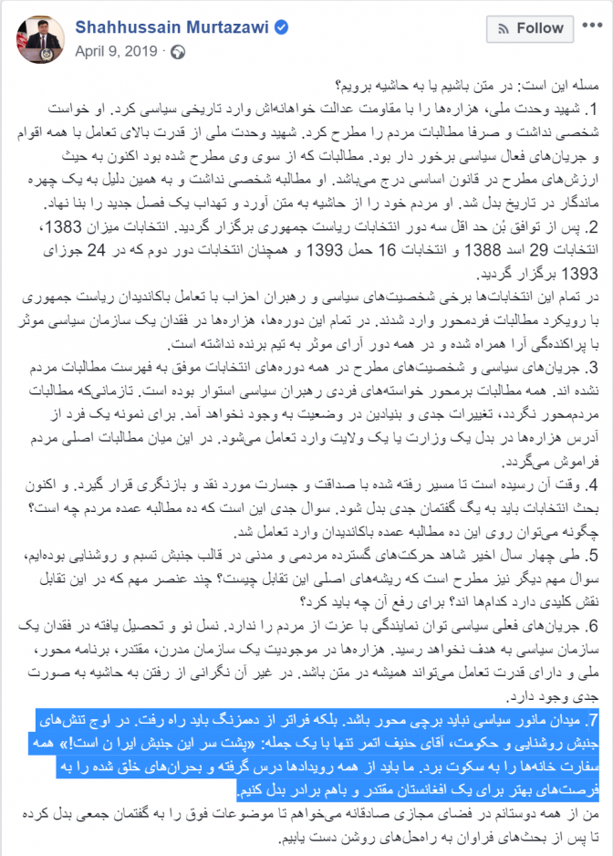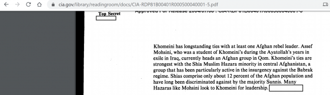 یک فعال هزاره می گوید ، "برای دهه ها ، در حالی که گروه های تروریستی پشتون مانند طالبان هزاره را قتل عام می کردند ، و دولتهای پشتون حقوق هزاره را تبعیض می کردند ، سیاستمداران و کارگزاران پشتون نیز چنین اتهامات دروغینی را به منظور غیرممکن ساختن هرگونه ارتباط محترمانه هزاره با جامعه جهانی. " این فعال یک سند محرمانه محرمانه سیا به عنوان نمونه ای از این اتهامات دروغین عنوان کرده است. در آن سند ، آصف محسنی ، یکی از فرماندهان جنگ مشهور پشتون ، به عنوان هزاره و پیرو خمینی معرفی شده است.